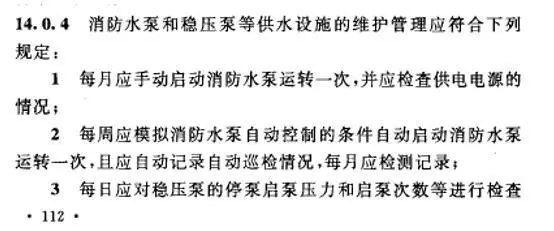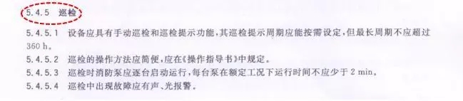在各個部分標準的前言中,均對該國標的強制執行與推薦執行部分進行了劃分,在各個國標第5章內容描述了對固定給水設備的控制要求,屬于強制執行部分。其中均提到的對消防泵巡檢的要求。下面截取了標準中的描述: