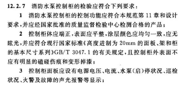 在第12.2.7.3章節中,提出消防水泵控制柜面板應設置巡檢狀況顯示,由此可見,消防水泵控制柜需要進行巡檢,實時反饋巡檢狀況。